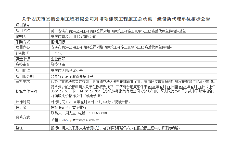 關(guān)于安慶市宜港公用工程有限公司對增項建筑工程施工總承包二級資質(zhì)代理單位招標公告