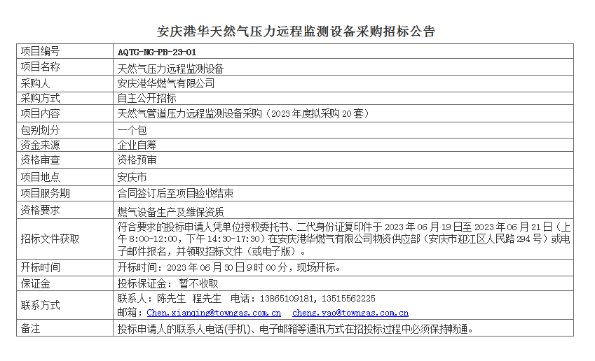 安慶港華天然氣壓力遠程監(jiān)測設備采購招標公告