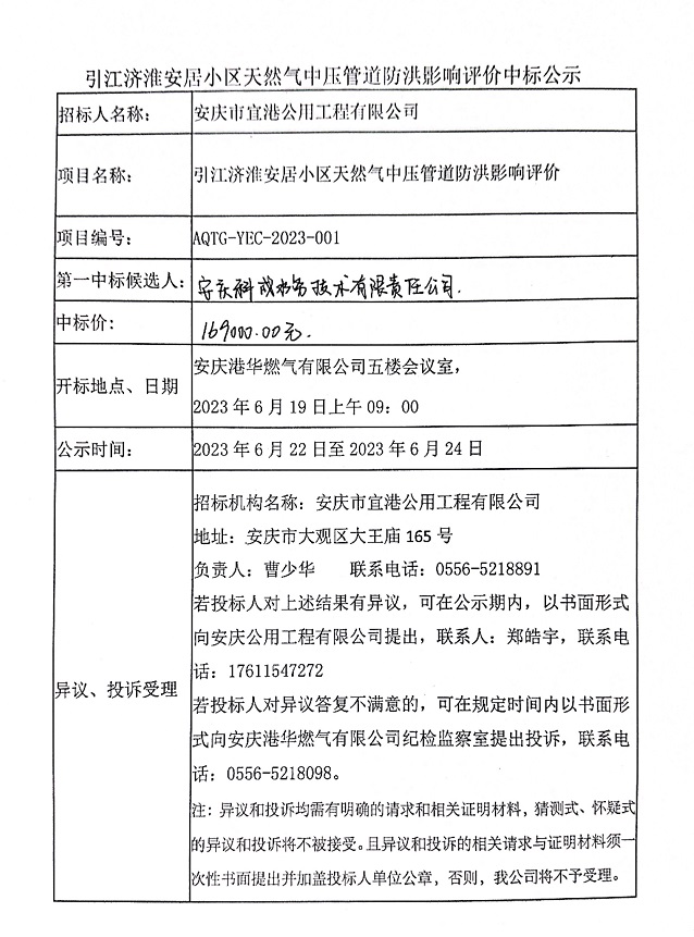 引江濟(jì)淮安居小區(qū)天然氣中壓管道工程防洪影響評(píng)價(jià)中標(biāo)公示