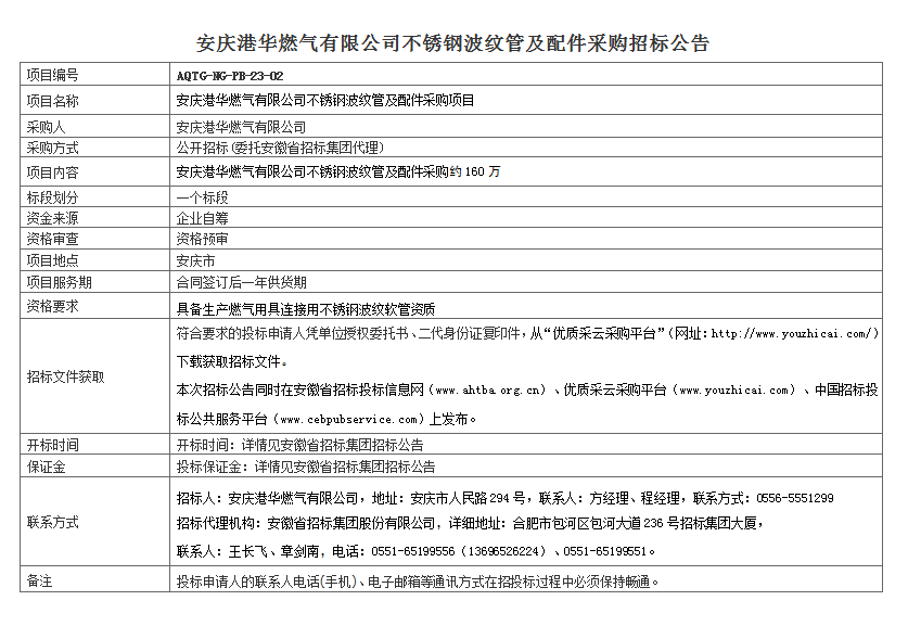 安慶港華燃?xì)庥邢薰静讳P鋼波紋管及配件采購招標(biāo)公告