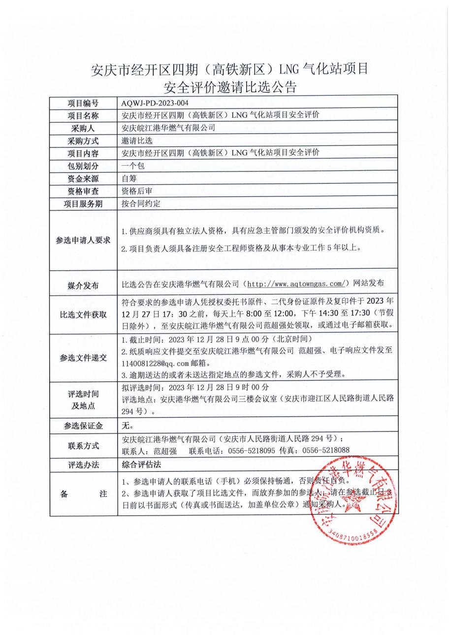 安慶經(jīng)開區(qū)四期(高鐵新區(qū))LNG氣化站安全評價(jià)邀請比選文件