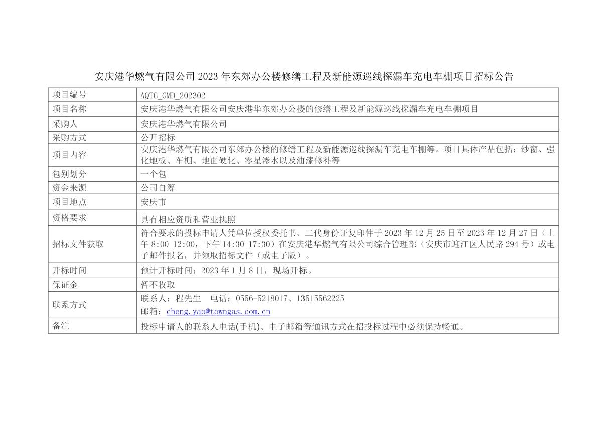 安慶港華東郊辦公樓的修繕工程及新能源巡線探漏車充電車棚項目招標公告
