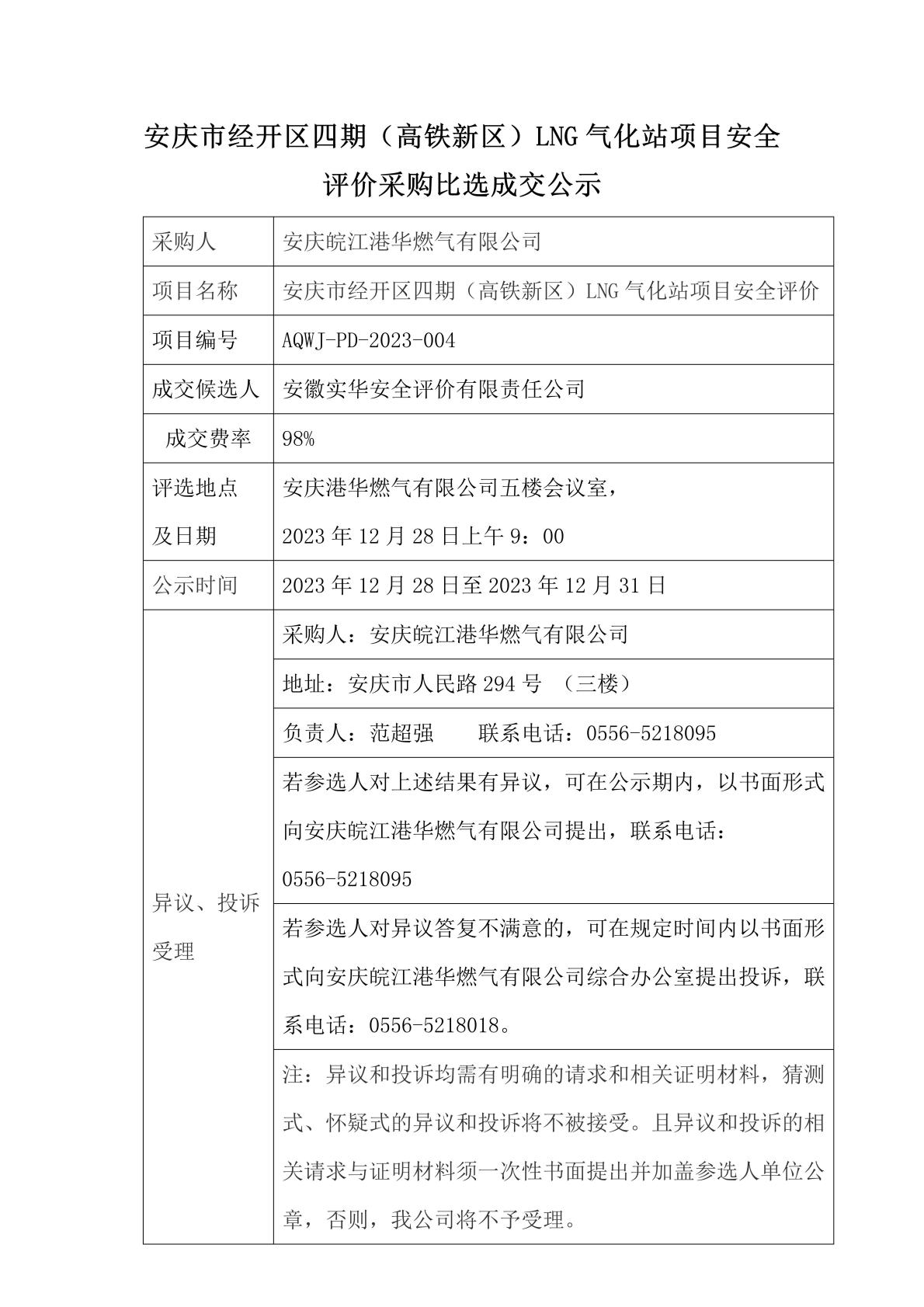安慶市經(jīng)開區(qū)四期(高鐵新區(qū))LNG氣化站項(xiàng)目安全評(píng)價(jià)采購(gòu)比選成交公示