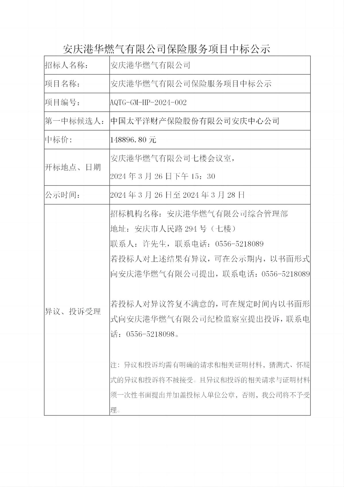 安慶港華燃?xì)庥邢薰颈kU(xiǎn)服務(wù)項(xiàng)目中標(biāo)公示