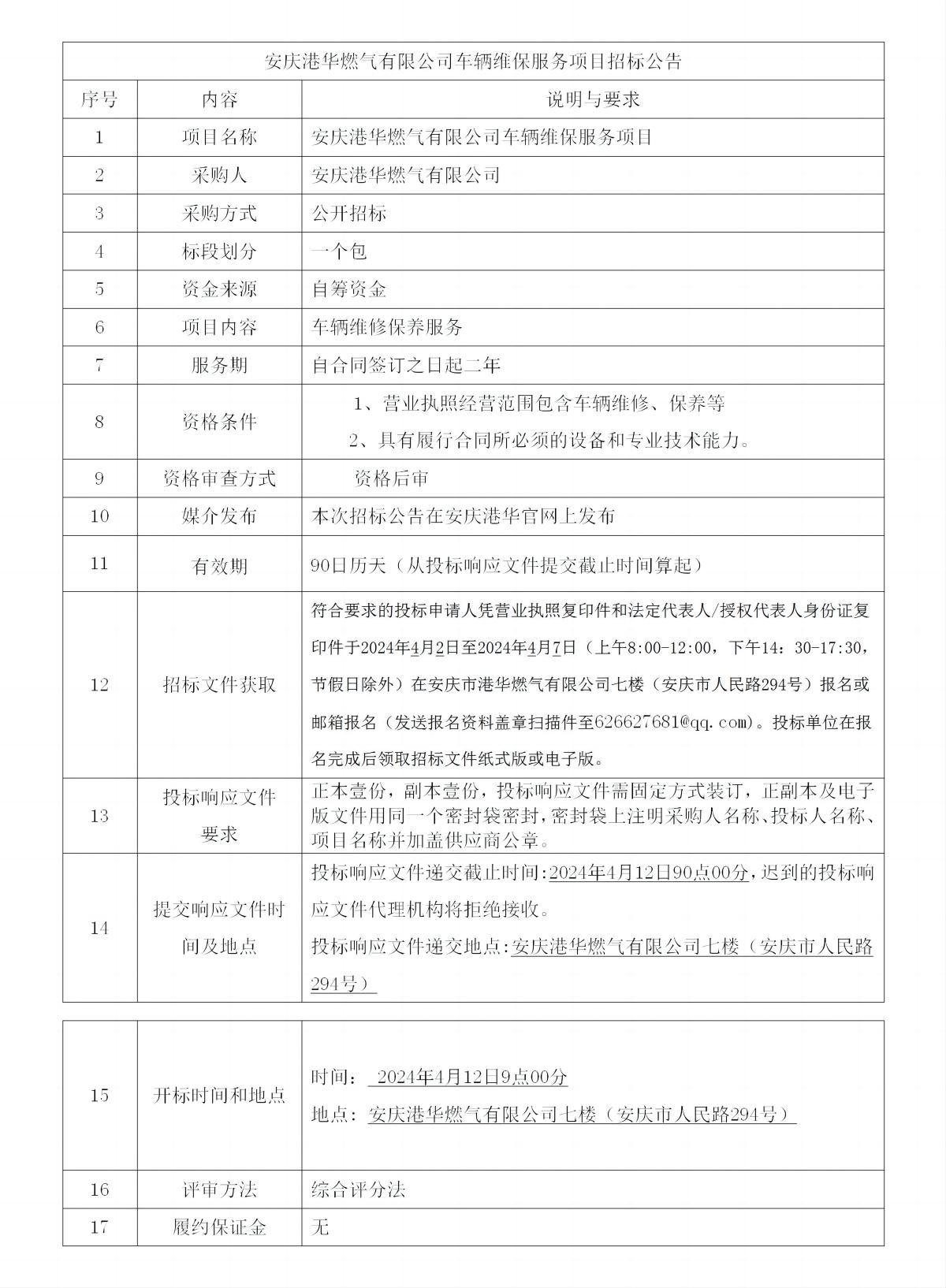 安慶港華燃氣有限公司車輛維保服務項目招標公告