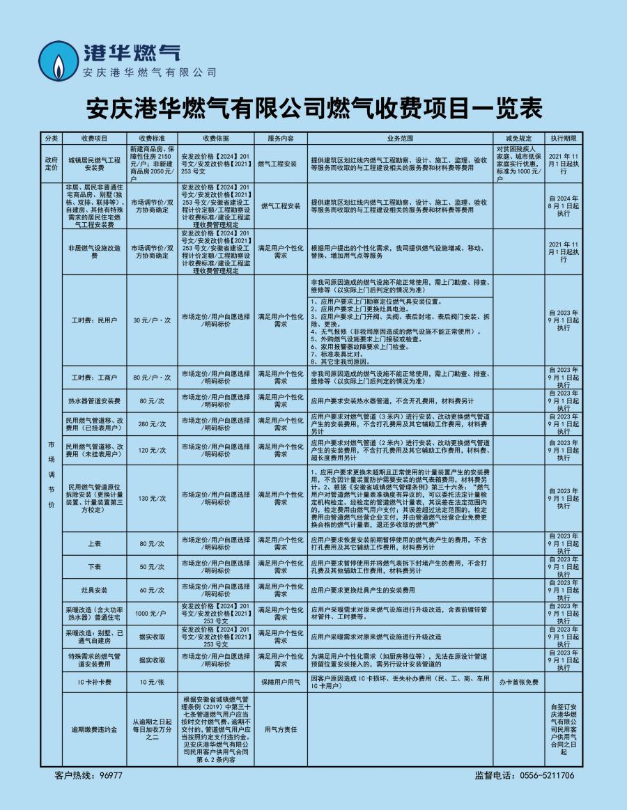 安慶港華燃氣有限公司收費項目一覽表(2025)