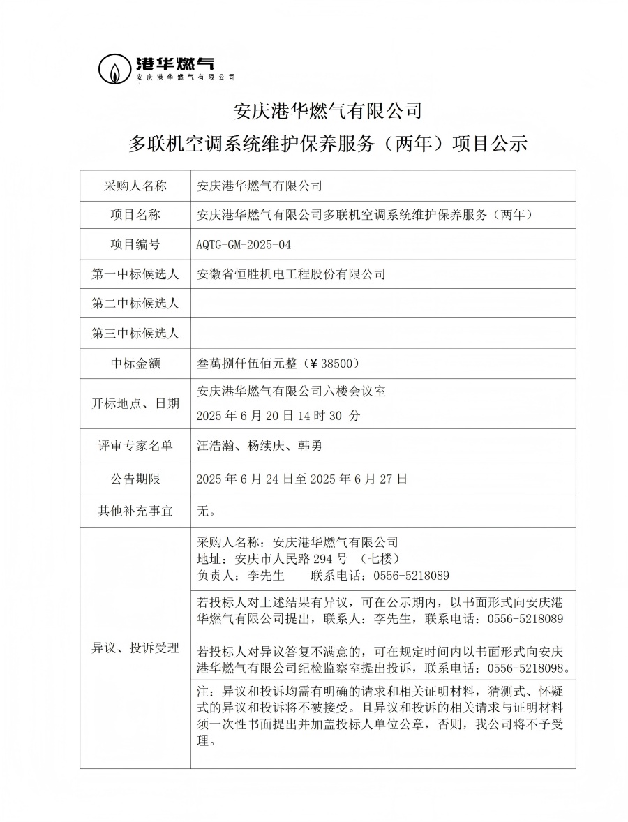 安慶港華燃?xì)庥邢薰径嗦?lián)機空調(diào)系統(tǒng)維護(hù)保養(yǎng)服務(wù)(兩年)項目公示