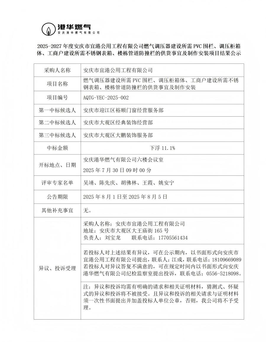 2025-2027年度安慶市宜港公用工程有限公司燃氣調(diào)壓器建設(shè)所需PVC圍欄、調(diào)壓柜箱體、工商戶建設(shè)所需不銹鋼表箱、樓棟管道防撞欄的供貨事宜及制作安裝項目結(jié)果公示