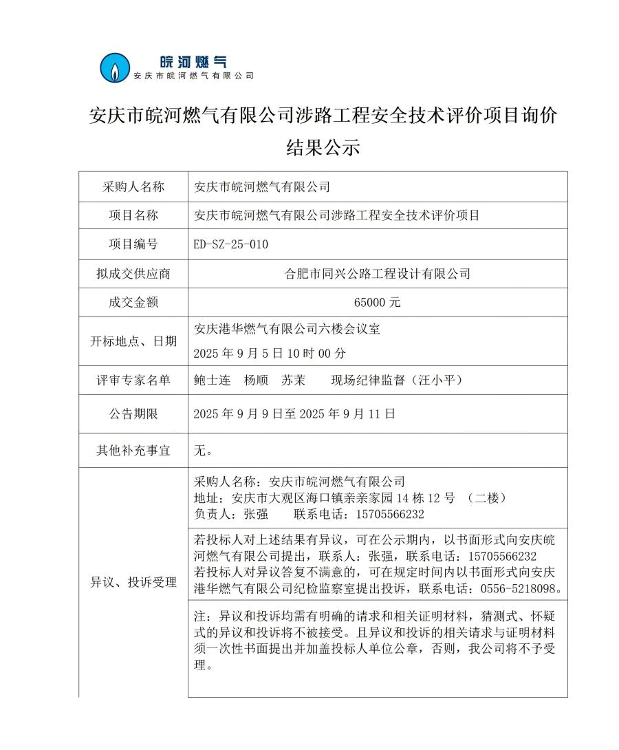 安慶市皖河燃氣有限公司涉路工程安全技術(shù)評價項目詢價結(jié)果公示