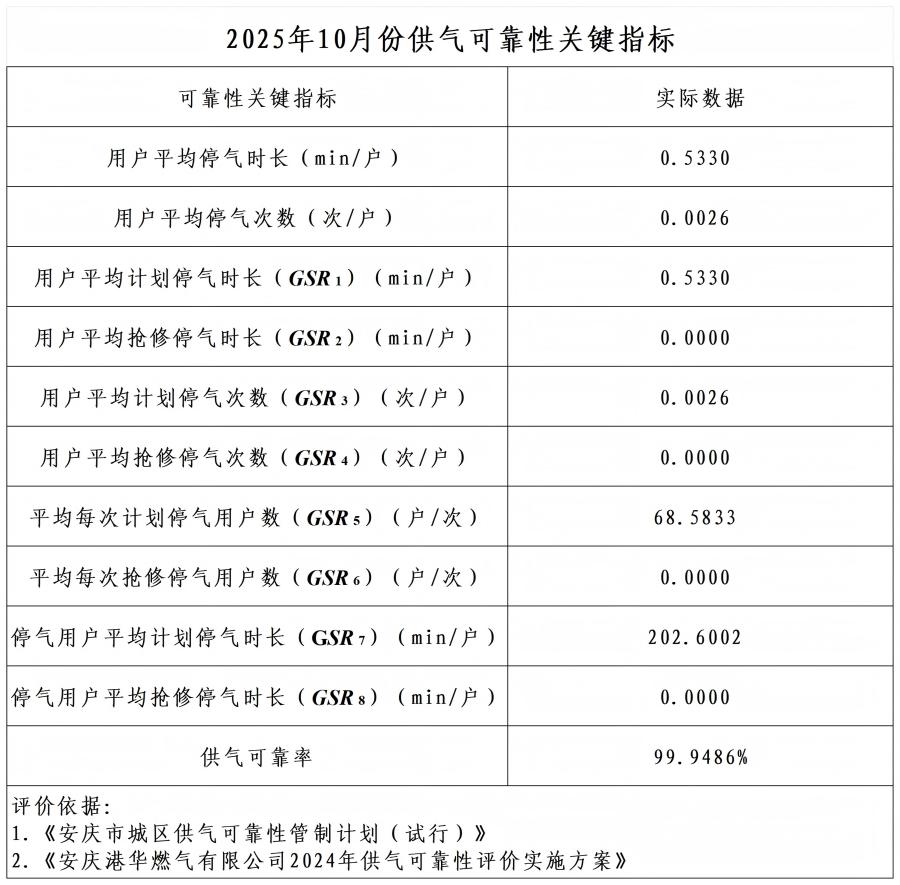 2025年10月供氣可靠性關(guān)鍵指標