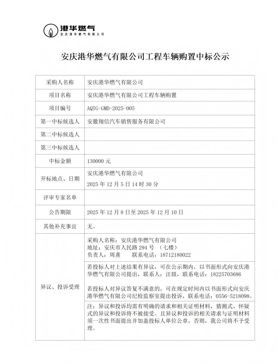安慶港華燃?xì)庥邢薰竟こ誊?chē)輛購(gòu)置中標(biāo)公示